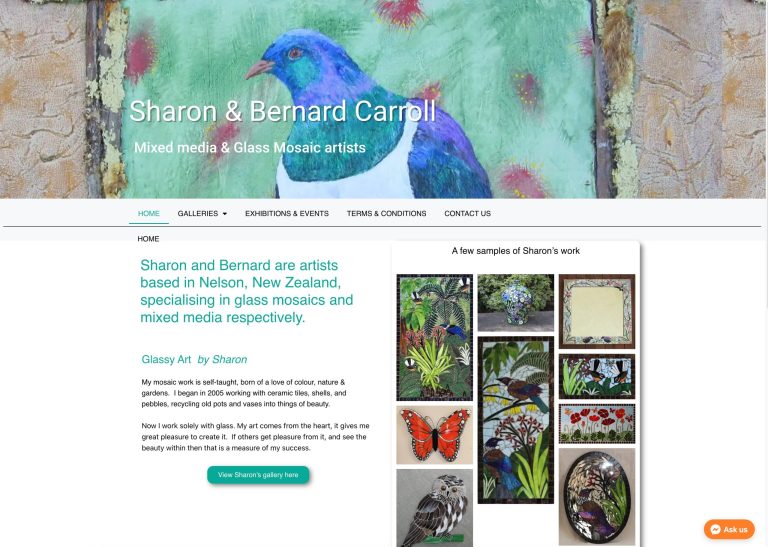 Bernard and Sharon wanted a clean yet colourful website, with the major focus on profiling their glass mosaics and mixed media through sortable or filterable galleries of images of their work. Each gallery smartly rearranges itself to fill the available space.